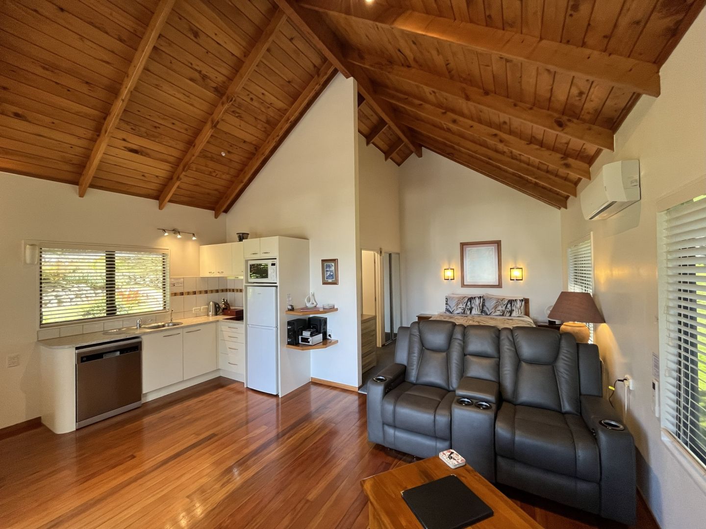 Featuring spacious Open Plan Living, the Palms is furnished with a King Bed, double Spa Bath, separate shower cubicle, full Kitchen facilities, Recliner Lounge Suite, Dining Suite and a BBQ on your deck; as well as having air-conditioning (Heat Pump/climate control). The Palms is your Home away from Home. From its elevated position, nestled in a private sub-tropical garden, the apartment has a wonderful Sea View looking out over central Paihia towards Russell and the outer Bay of Islands.